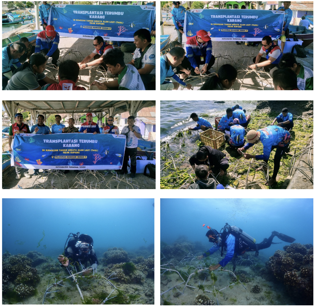 Kegiatan transplantasi terumbu karang pada kawasan taman wisata alam laut teluk kupang yang pelaksanaan kegiatan berlokasi pada pelabuhan namosain, kecamatan alak, dihadiri oleh perwakilan PT Pertamina Patra Niaga Integrated Terminal Tenau, Politeknik Kelautan dan Perikanan Kupang, Perwakilan Kelurahan Namosain, dan Komunitas Anana Laut.
