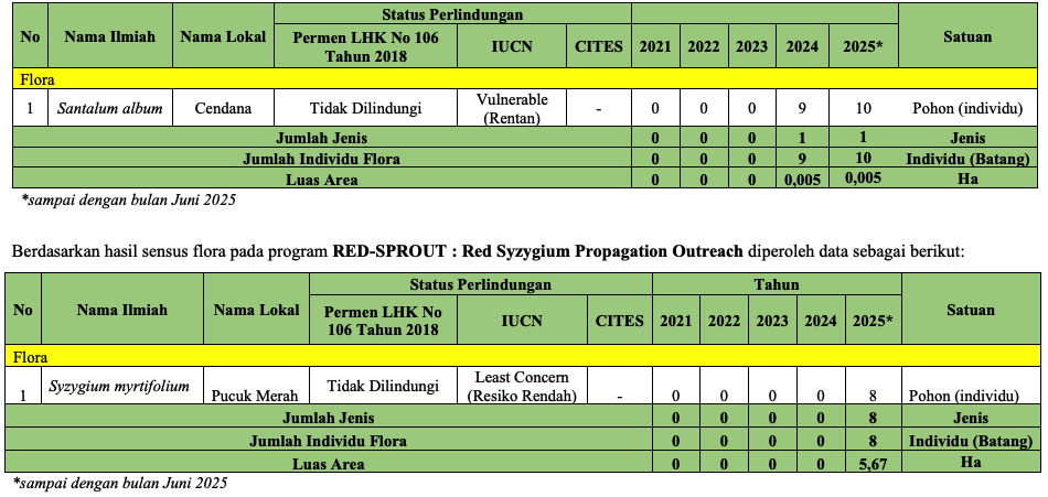 Berdasarkan hasil sensus flora pada program Optimasi Pertumbuhan Pohon Cendana dengan Menggunakan PUSPANG (Pupuk Sisa Pangan) diperoleh data sebagai berikut