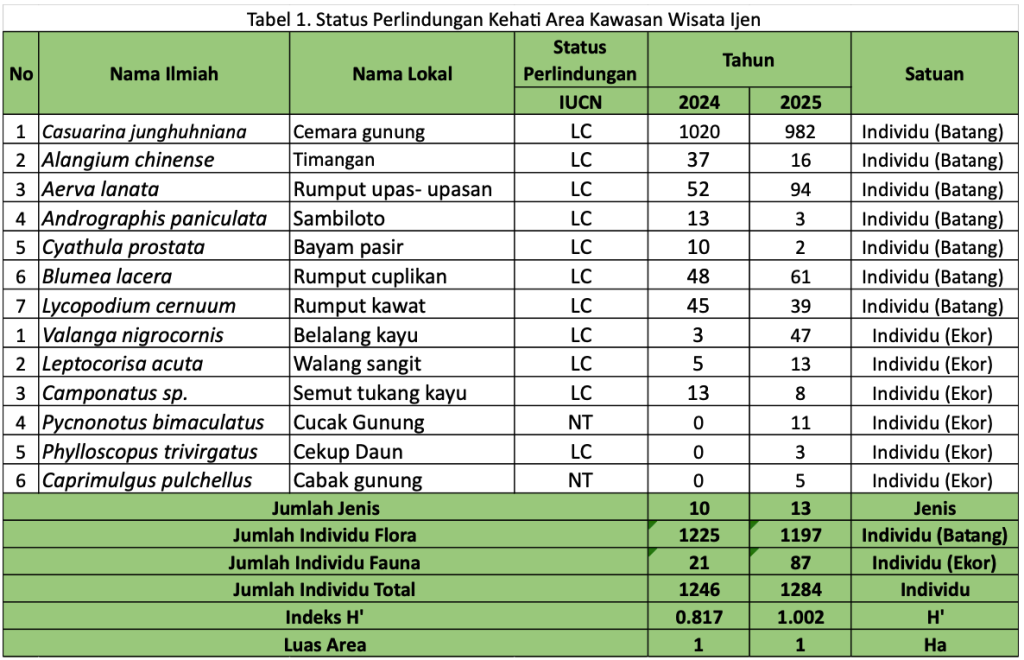 Penanaman pohon Cemara Gunung pada Tahun 2024 dilakukan sebagai respon terhadap permasalahan lahan kritis yang terjadi di Kawasan Ijen. Penanaman pertama yang dilakukan oleh IT Tanjung Wangi ialah pada tahun 2022. Penanaman tersebut dilakukan sebagai respon dari kebakaran lahan yang terjadi saat itu. Selanjutnya, pada September 2023, Kawasan Ijen mengalami kebakaran akibat musim kemarau berkepanjangan. Salah satu dampak yang ditimbulkan ialah terbakarnya Pohon Cemara Gunung yang merupakan tanaman endemik Kawasan Ijen. Berangkat dari permasalahan tersebut, Pertamina Patra Niaga IT Tanjung Wangi dan AOC Jatimbalinus berkolaborasi bersama dengan BKSDA Jawa Timur untuk melakukan pemeliharaan lingkungan dengan melakukan penanaman pohon guna memulihkan, menguatkan dan mengembalikan fungsi kawasan Taman Wisata Alam (TWA) Ijen. Selain berkontribusi terhadap perlindungan lingkungan, kegiatan ini juga diharapkan dapat memperkuat daya tarik ekowisata kawasan Ijen, memberikan manfaat jangka panjang bagi ekosistem serta mendukung keberlanjutan pariwisata yang ramah lingkungan di daerah tersebut. Pada Tahun 2025 IT Tanjung Wangi melaksanakan kegiatan monitoring terhadap penanaman pohon cemara gunung di Kawasan Wisata Ijen Bersama dengan HPKWI. Monitoring dilakukan guna mengetahui perkembangan dan pertumbuhan dari pohon yang ditanam serta dapat melakukan perawatan rutin. Berdasarkan hasil monitoring terdapat peningkatan indeks diversitas di area Kawasan Wisata Ijen. Tabel Status dan Absolut dari Program penghijauan di Kawasan Wisata Ijen dapat dilihat pada Tabel dibawah ini.